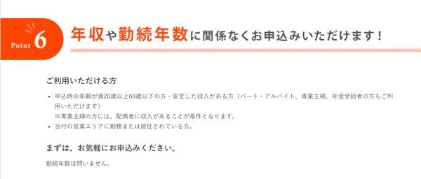 - 申込み時の年齢が満20〜69歳以下の安定した収入がある方(パートやアルバイト可)