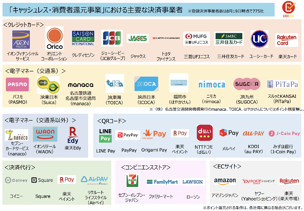 キャッシュレス・消費者還元事業のポイント還元制度の対象となる支払い方法