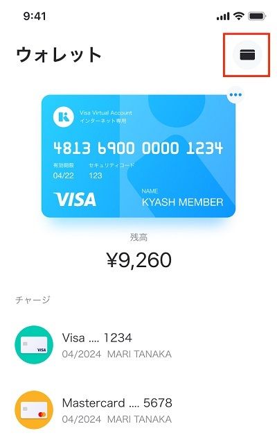 1.まずは、Kyashアプリのウォレットを開いて、画面右上にあるカードマークをタップします。