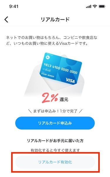 2.リアルカード有効化をタップします