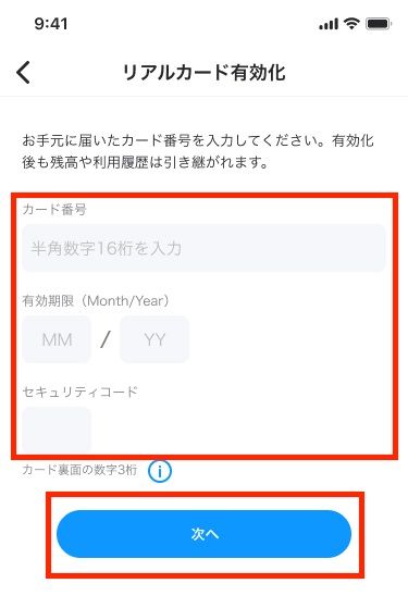 3.リアルカードに記載のカード番号、有効期限、セキュリティコードをそれぞれ入力し「次へ」をタップします