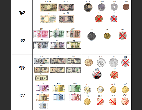 | 日本円 | 1,000円、2,000円、5,000円、10,000円 | 500円、100円、50円、10円 |