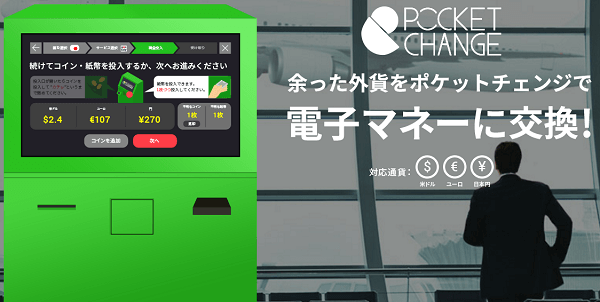 ポケットチェンジも外貨を電子マネーに交換できるサービスです。こちらはまだ本格導入されていませんが、国内大手の電子マネーに対応した状態でスタートを予定しているため、サービスが開始されれば多くの方に喜ばれそうです。現在は、提携先である楽天株式会社の本社に試験的に設置されており、本格導入までの準備を行っています。