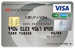 スーパーICカード Suica「三菱UFJ-VISA」、「三菱UFJ-VISAゴールド」はクレジットカード、キャッシュカード、Suicaの一体型カードです。