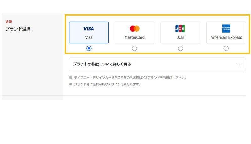 また、この「基本」情報の入力ページでは上記の画像のように、VISA・MasterCard・JCB・American Expressの4種類からブランドを選びます。