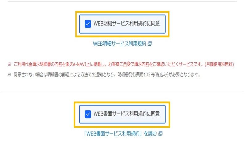 スクロールしていくと、「WEB明細サービス利用規約に同意」・「WEB書面サービス利用規約に同意」の欄が出てくるので、内容を確認しチェックを入れます。